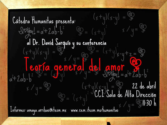Tengo el gusto de invitarles a la conferencia que impartirá nuestro colega, el Dr. David Sarquís, con el título «Una teoría general del amor», el día martes 22 de abril, a las 11,30, en la Sala de Alta Dirección del CCI del Tecnológico de Monterrey, Campus Estado de México.