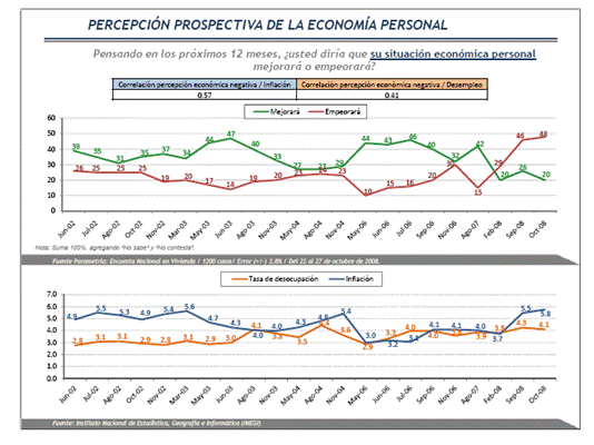 Estudio: Encuestas en vivienda. Representatividad: Nacional. Número de entrevistas: 1,200. Nivel de confianza estadística: 95%. Margen de error (+/-) 2.8%. Diseño, muestreo y análisis: Parametría SA de CV. Operativo de Campo: Lumich Consultores. Método de muestreo: Aleatorio sistemático con probabilidad proporcional al tamaño. Unidad de muestreo: Las secciones electorales reportadas por el IFE. Fecha de levantamiento: del 22 al 27 de Octubre del 2008.
