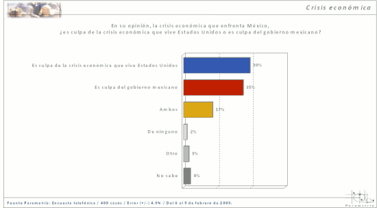 No obstante las preocupaciones de los mexicanos, se registran altos niveles de justificación para la labor del Presidente Calderón en el delicado rubro de la economía. Impera la idea de que la crisis viene de fuera y no es su responsabilidad en sentido estricto. Estos niveles de justificación suceden también con los ejecutivos de otros países, incluyendo al propio Presidente Obama, quien hereda una crisis de la administración anterior, según señalan datos de Pew Research.