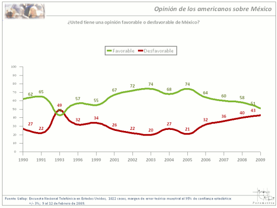 Las explicaciones de esta baja en la opinión favorable para México no resultan tan obvias. Se podría pensar que se debe a los altos niveles de inseguridad que han sido reportados en toda la prensa estadounidense. Entonces todo parecería indicar que son nuestros problemas de inseguridad los que dañan la imagen país. Sin embargo al revisar la serie histórica encontramos el punto más bajo se registra en 1993, justo durante las negociaciones del TLC en que el porcentaje de opinión favorable es solo de 43%.. žSerá que los estadounidenses no forman su percepción de México sólo por el tema de inseguridad, sino que en circunstancias distintas también ha influido nuestra proximidad en términos económicos? Este es sólo una observación para reflexión, nada concluyente, pero tal vez si indicativa que la inseguridad no lo es todo y tal vez haya algo de nuestra situación económica en algún momento ha impactado o podría impactar lo que piensan en Estados Unidos de nosotros.