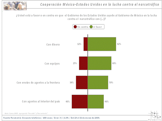 Encuesta Nacional Telefónica de Parametría. Representatividad: Hogares a nivel nacional que cuentan con teléfono en su vivienda. Número de entrevistas: 400. Nivel de confianza estadística: 95%. Margen de error (+/-) 4.9%. Diseño de cuestionario, levantamiento y análisis: Parametría SA de CV. Fecha de levantamiento: 28 al 31 de marzo de 2009.