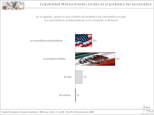 Al cuestionar quién es responsable del problema del narcotráfico, la mayoría de los mexicanos se muestran autocríticos y responsabilizan a los propios compatriotas de ser susceptibles de corrupción, más que a los consumidores estadounidenses. Prácticamente dos de cada tres mexicanos consideró que la corrupción nacional es la responsable (62%), mientras que sólo el 26% cree que los consumidores estadounidenses han generado esta situación.
