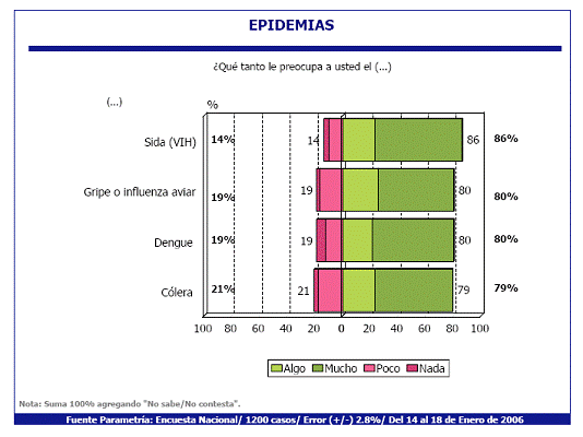 Entre las enfermedades infecciosas evaluadas en una encuesta realizada por Parametria , el SIDA (86 por ciento) aparece como el de mayor preocupación seguido de influenza aviar y el dengue (80 por ciento) y ligeramente abajo cólera (79 por ciento). Este ordenamiento en las preocupaciones probablemente se debe a que el Síndrome de Inmunodeficiencia Adquirida se le considera fatal y sin cura conocida. Sin embargo, los otros tres padecimientos no aparecen con mucho menor porcentaje de preocupación. Es decir, los mexicanos son una población con predisposición para preocuparse por este tipo de eventos y son relativamente conocidos. Una pregunta legítima con estos números sería si con estos niveles de preocupación se hubiera podido hacer algo preventivo.