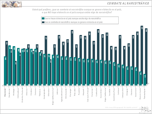 Ahora bien, aunque es cierto que una buena parte de los mexicanos apoyan el esfuerzo del presidente Calderón en la guerra contra el narco, también es cierto que este apoyo no es homogéneo en todo el país. Ante la pregunta de qué es mejor “žQue no haya violencia en el país aunque exista algo de narcotráfico o que se combata el narcotráfico aunque se genere violencia en el país?” la mitad de los mexicanos (51%) está con el presidente, mientras que una minoría (34%), estaría dispuesta a tolerar la presencia del narco.