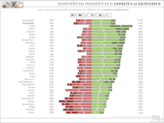 NOTA METODOLÓGICA. Estudio: Encuestas en vivienda. Representatividad: Estatal. Número de entrevistas por estado: 400. Número de entrevistas a nivel nacional: 12,800. Nivel de confianza estadística: 95%. Margen de error por estado (+/-) 4.9%. Margen de error a nivel nacional (+/-) 0.9%. Diseño, muestreo y análisis: Parametría SA de CV. Método de muestreo: Aleatorio sistemático con probabilidad proporcional al tamaño. Unidad de muestreo: Las secciones electorales reportadas por el IFE. Fecha de levantamiento: del 21 de Febrero al 8 de Marzo del 2009.