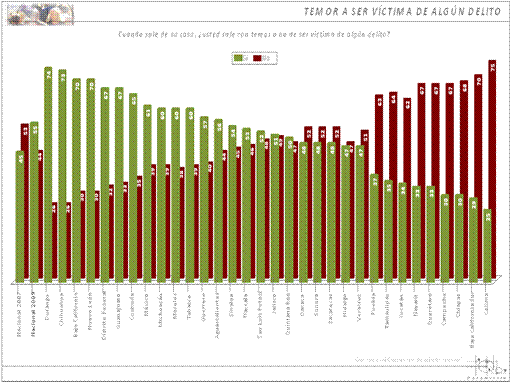 Cada vez son más los mexicanos que se sienten temerosos de ser víctimas de la delincuencia una vez que salen de sus casas a realizar sus actividades cotidianas. En agosto del 2007, el 45% de las personas dijo sentirse insegura al momento de dejar su domicilio, mientras que en marzo del 2009 este dato se ubica en 55%. Un incremento de diez puntos porcentuales en año y medio.