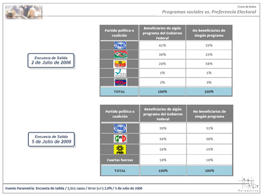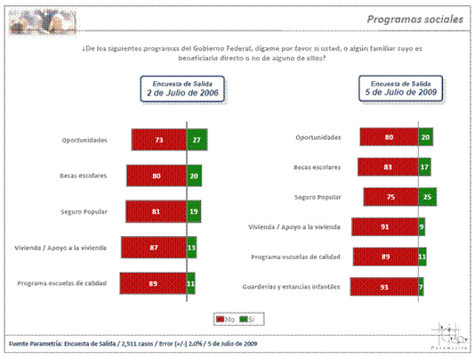 Los resultados de la encuestas de salida de Parametría del 2006 y 2009 muestran que hace tres años se presentaron a votar un mayor número de beneficiarios de las políticas públicas proporcionadas por la administración federal. Por ejemplo, en el 2006 una tercera parte de las personas que acudieron a las urnas era beneficiaria o tenía algún familiar que recibía Oportunidades, mientras que en el 2009 sólo a dos de cada diez votantes se le entrega directa o indirectamente este programa.