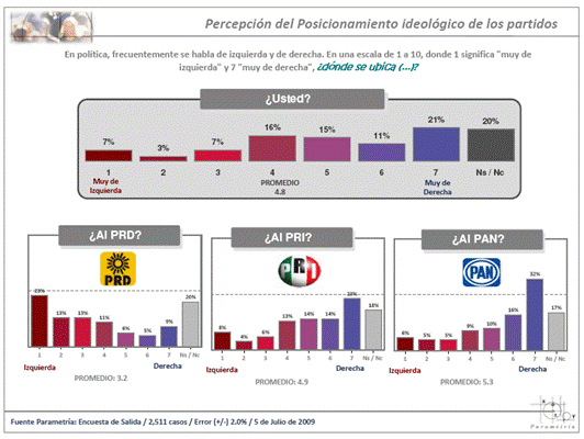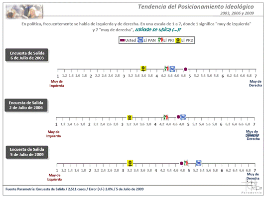 Las Encuestas de Salida de Parametría de 2009, 2006 y 2003 nos enseñan la variabilidad del concepto y como desde la percepción del votante, el Partido Acción Nacional (PAN) se ha ido moviendo a la derecha, mientras que el Partido Revolucionario Institucional (PRI) se acerca más al elector.