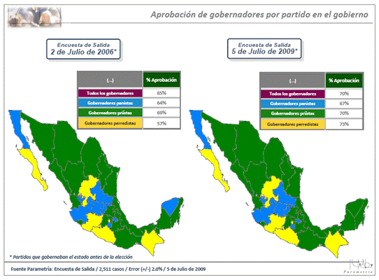 En el caso de los estados donde gobierna el PRI, de las personas que aprobaban a los gobernadores priístas en el 2006, el 41% votó por el partido tricolor, mientras que en el 2009 este porcentaje llegó hasta 47%.