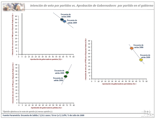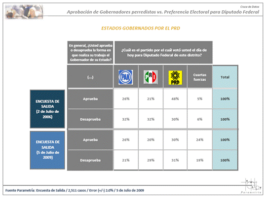 Estudio: Encuesta de salida del 5 de julio de 2009. Número de entrevistas: 2,511. Nivel de confianza estadística: 95%. Error muestral (+/-) 2.0%. Diseño, muestreo, operativo de campo y análisis: Parametría SA de CV. Método de muestreo: Aleatorio sistemático con probabilidad proporcional al tamaño. Unidad de muestreo: Las secciones electorales reportadas por el IFE.