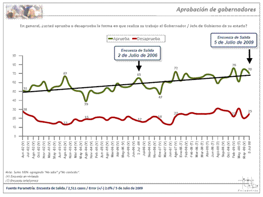 Si se observan los niveles de aprobación de los gobernadores a través del tiempo, puede apreciarse que desde el 2002 a la fecha, existe una tendencia ascendente en la evaluación que sus gobernados les otorgan. Esto también queda manifiesto en las encuestas de salida de Parametría del 2006 y 2009, donde la aprobación que los votantes les dieron a los ejecutivos estatales fue de 65% y 70% respectivamente.