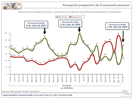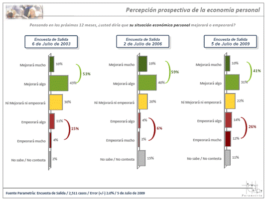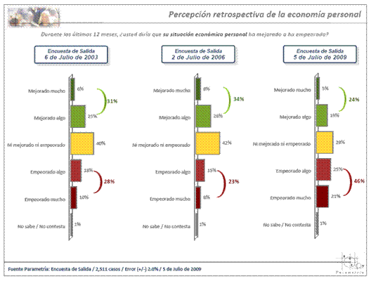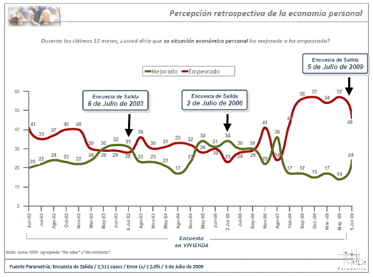 En el 2003, el 28% de los electores que acudieron a las urnas señaló que su economía personal había empeorado, en el 2006, este porcentaje se redujo a 23%, pero en el 2009, el número de votantes que indican que sus finanzas se deterioraron llegó hasta 46%. Es decir, casi la mitad de los electores que sufragaron el 5 de julio llegó con sus bolsillos en mal estado.