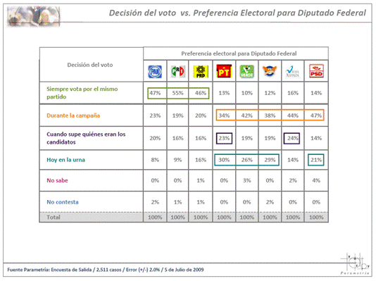 Estudio: Encuesta de salida del 5 de julio de 2009. Número de entrevistas: 2,511. Nivel de confianza estadística: 95%. Error muestral (+/-) 2.0%. Diseño, muestreo, operativo de campo y análisis: Parametría SA de CV. Método de muestreo: Aleatorio sistemático con probabilidad proporcional al tamaño. Unidad de muestreo: Las secciones electorales reportadas por el IFE.