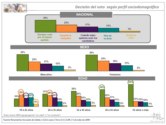 Las personas mayores de 46 años y en especial aquellos que superan los 55 años de edad, son los que suelen votar en mayor medida por el partido de siempre. Mientras que los individuos menores de 35 años decidieron su voto durante la campaña o cuando se enteraron quienes eran los candidatos.