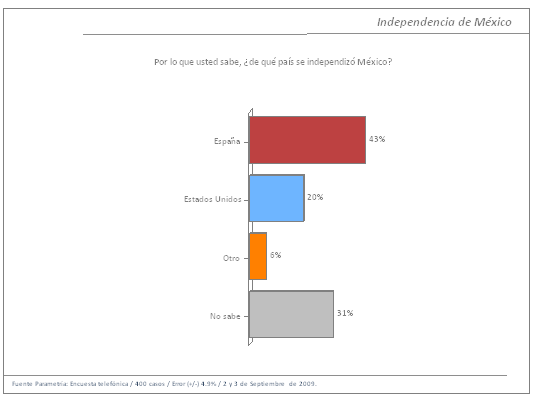 Pero el dato más penoso está relacionado con el país del cuál se independizó México, ya que el 57% de la gente no sabe o dice un país diferente a España. Únicamente el 43% señala la repuesta correcta (España), mientras que el 20% piensa que México se independizó de Estados Unidos.