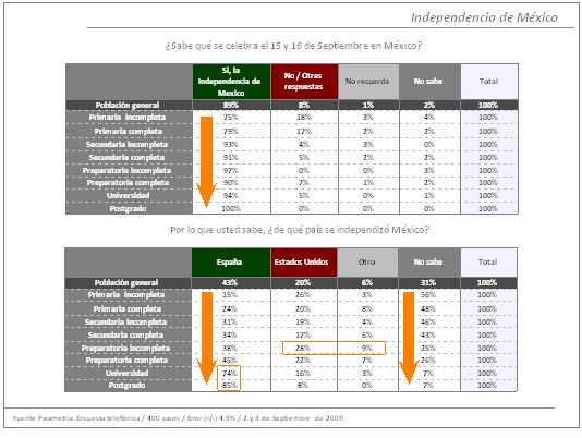 Sin duda la escolaridad influye de manera determinante en el conocimiento que se tiene de las fiestas patrias, más allá de la parafernalia y de los ánimos de festejo para lo cual los mexicanos se pintan solos. Pero considerando la gran publicidad que se tiene de esta fecha tan simbólica con motivo de la proximidad del bicentenario de la Independencia; también tendría que plantearse si están funcionando las lecciones de historia en todos los niveles educativos, pues menos de la mitad de la población conoce la historia de Independencia.