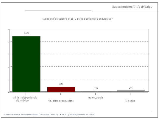 Encuesta Nacional Telefónica de Parametría. Representatividad: Hogares a nivel nacional que cuentan con teléfono en su vivienda. Número de entrevistas: 400. Nivel de confianza estadística: 95%. Margen de error (+/-) 4.9%. Diseño de cuestionario, levantamiento y análisis: Parametría SA de CV. Fecha de levantamiento: 2 y 3 de septiembre del 2009.