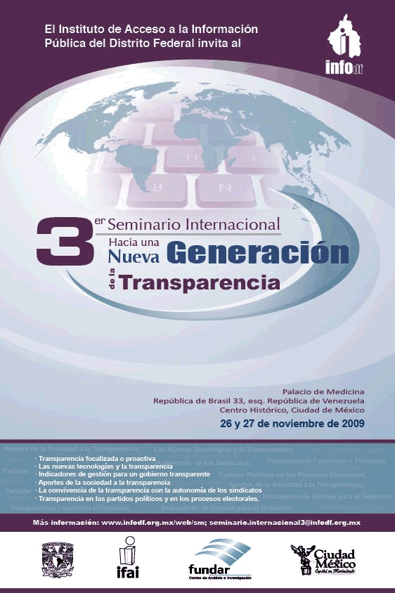 El Instituto de Acceso a la Información Pública del Distrito Federal (InfoDF), consciente de esta realidad, celebrará su Tercer Seminario Internacional: Hacia una nueva generación de la transparencia, el cual se llevará a cabo los días 26 y 27 de noviembre de 2009 en el Palacio de la Escuela de Medicina, ubicado en República de Brasil 33, Centro Histórico de la Ciudad de México.
