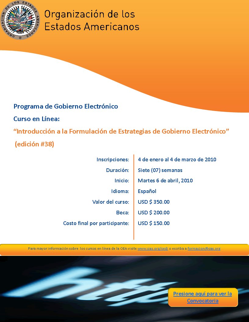 La Organización de los Estados Americanos OEA por medio de la Secretaría de Asuntos Políticos –SAP- ha venido ofreciendo becas de formación en el área de gobierno electrónico y certificando a miles de participantes en Latinoamérica y el Caribe