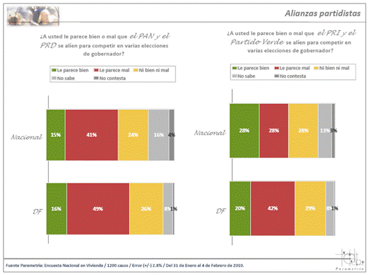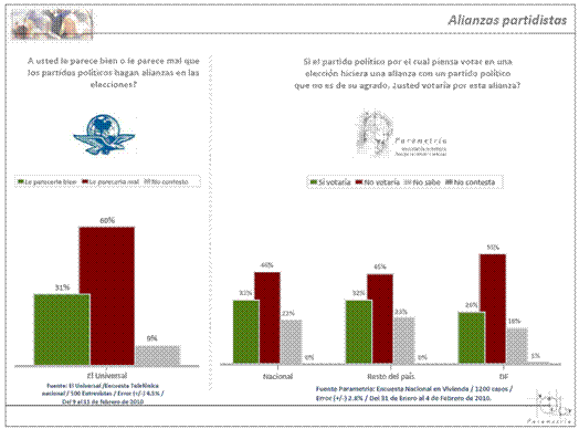 De la misma manera Parametría realizó también un diagnóstico sobre las alianzas electorales. Los resultados son similares: el 46% de la población a nivel nacional dijo que no apoyaría una coalición en la que el partido político de su preferencia se aliara con otro al que no encontrase de su agrado.