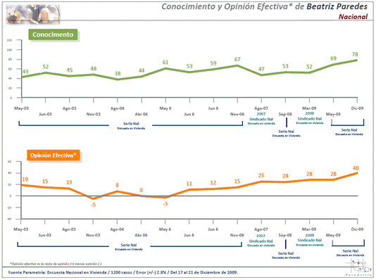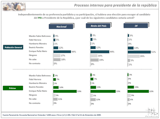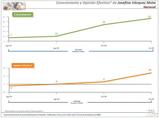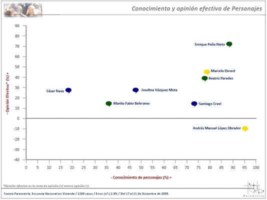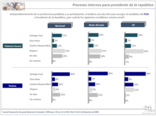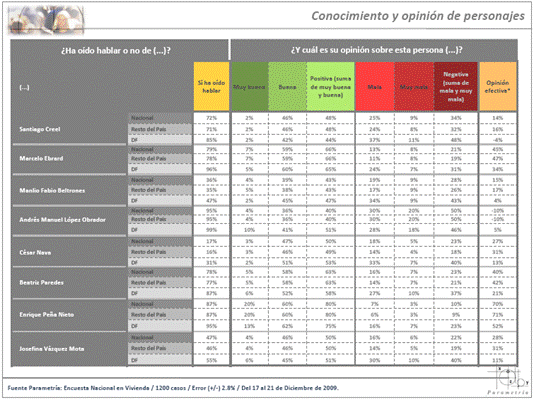 • PARAMETRÍA: Encuesta en vivienda. Representatividad: Nacional. Número de entrevistas: 1,200. Nivel de confianza estadística: 95%. Margen de error (+/) 2.8%. Diseño, muestreo y análisis: Parametría SA de CV. Operativo de Campo: Lumich Consultores. Método de muestreo: Aleatorio sistemático con probabilidad proporcional al tamaño. Unidad de muestreo: Las secciones electorales reportadas por el IFE. Fecha de levantamiento: del 17 al 21 de Diciembre del 2009.