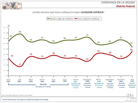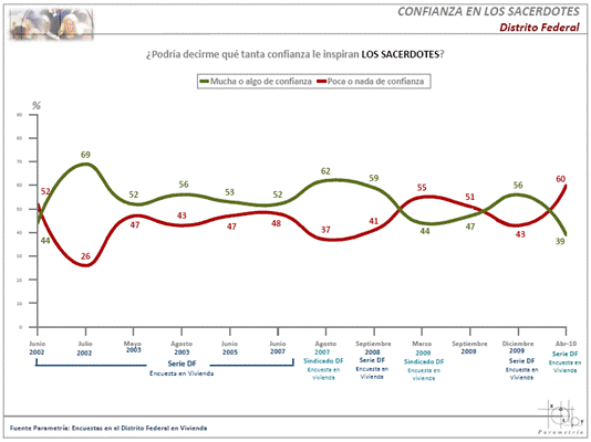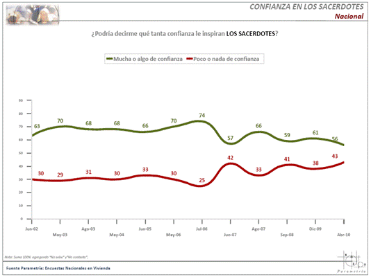 Sin embargo, la imagen de los sacerdotes aunque sigue siendo positiva (60% de confianza) se ha visto afectada por los escándalos de pederastia, sobre todo en lugares como la Ciudad de México.