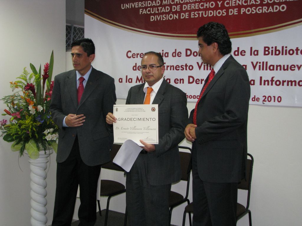 El maestro Jesús Santillán en nombre de la rectora Silvia María Figuera Zamudio y el Jefe de la División de Estudios de Posgrado, Héctor Pérez Pintor, recibieron el acervo de más de 2 mil libros sobre temas relacionados con el derecho de la información, publicados en español, inglés, francés, portugués y alemán, lo cual la convierte en la biblioteca más completa en su tema en México y una de las dos más grandes de América Latina.