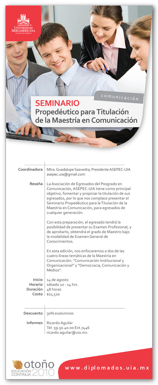 La Asociación de Egresados del Posgrado en Comunicación A.C. (ASEPEC-UIA) invita a los egresados de cualquier generación, interesados en titularse bajo la modalidad de Examen General de Conocimientos, a que se inscriban al «SEMINARIO PROPEDÉUTICO PARA TITULACIÓN DE LA MAESTRÍA EN COMUNICACIÓN».