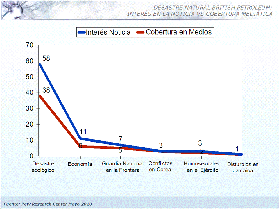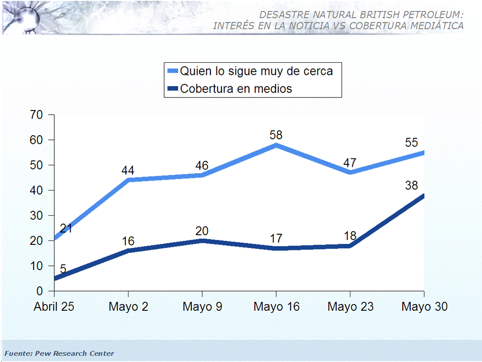 Apenas 5 días después de la explosión (20 de abril), dos de cada diez personas en Estados Unidos estaba muy interesada en el asunto, mientras que la cobertura de los medios era 16 puntos menor.