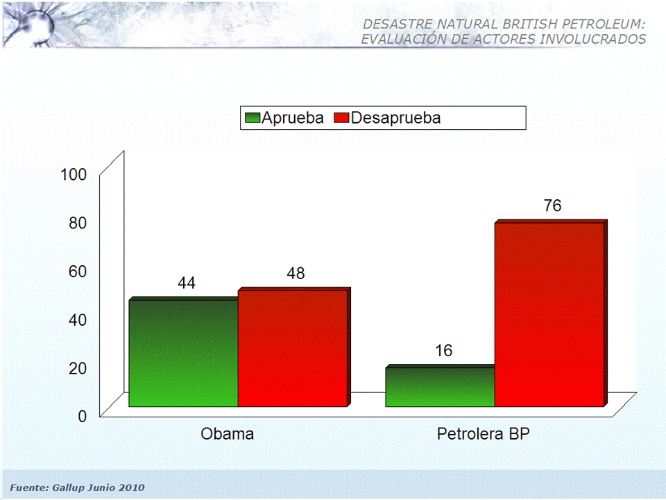Respecto a la evaluación del Presidente Obama y British Petroleum sobre la forma en que reaccionaron ante la tragedia, el 44% de los norteamericanos aprueba el desempeño de Obama, y el 48% lo desaprueba; entretanto únicamente el 16% acepta la actuación de British Petroleum frente el problema.