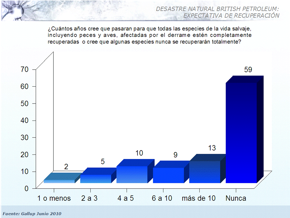 Finalmente, el 50% de los estadounidenses cree que las playas afectadas por el derrame petrolero nunca se recuperarán totalmente, y en el caso de la fauna, este porcentaje asciende a 60%.