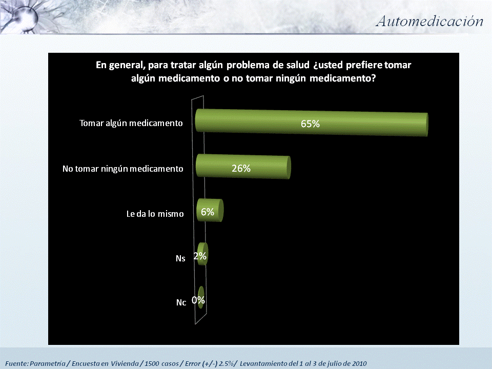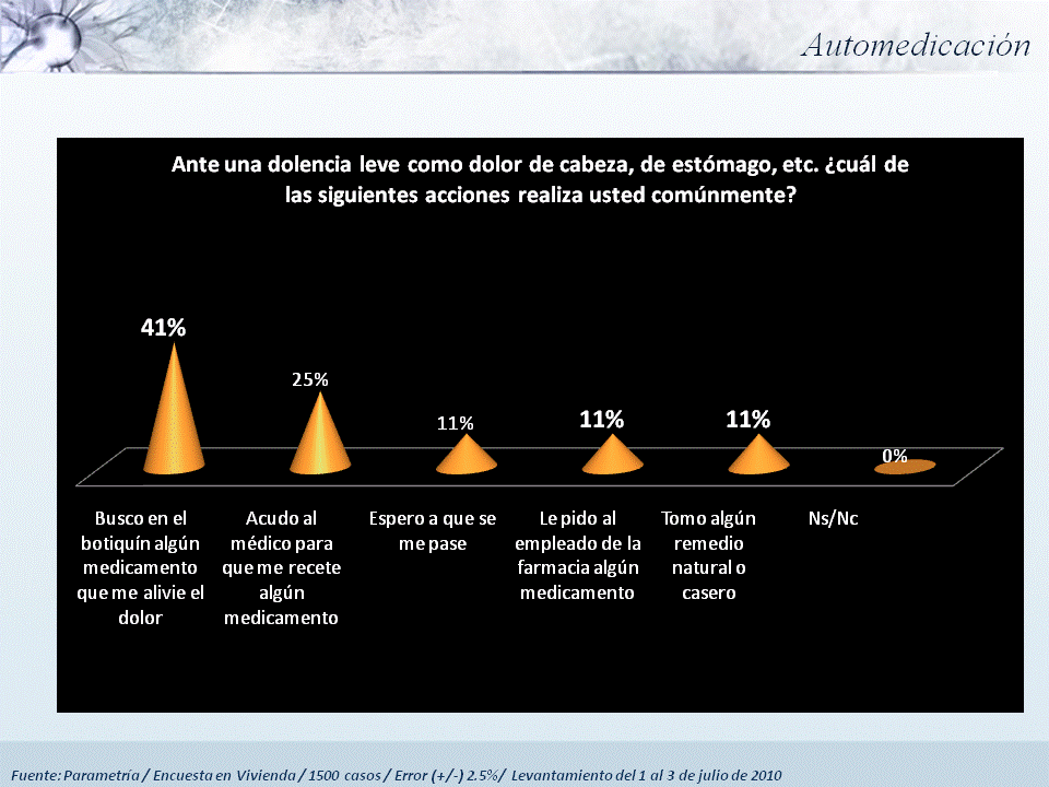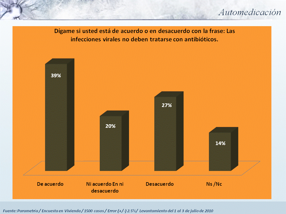 La venta excesiva de antibióticos está precedida de un problema aún más grave, la automedicación. Casi una tercera parte de los mexicanos se automedica para padecimientos que se consideran serios (31%, en opinión del entrevistado), y más del 50% lo hace en caso de padecimientos que se evalúan como “leves”.