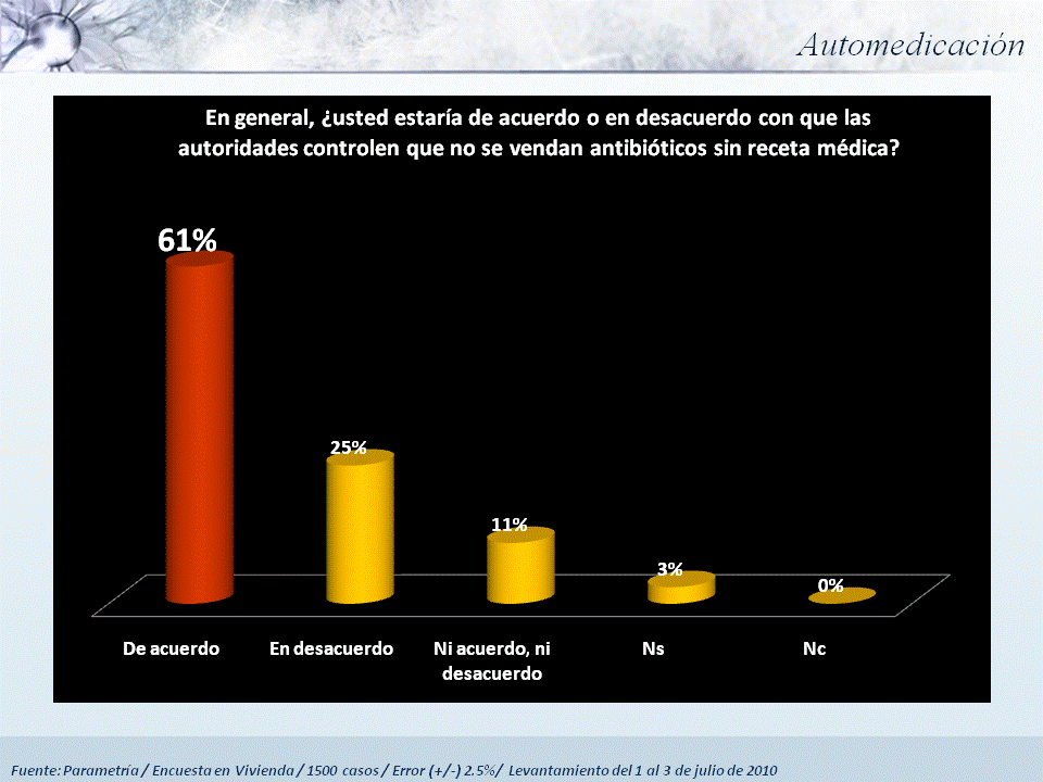 Frecuentemente, para cambiar un comportamiento, no es suficiente modificar la regulación o restringir los hábitos en curso. Es fundamental que se cuente con la cooperación y el acuerdo de los afectados por la medida. Si bien es cierto que la mayor parte de los entrevistados (60%) está de acuerdo con esta política, no dejan de ser preocupantes las prácticas de quienes consumen antibióticos o se automedican.