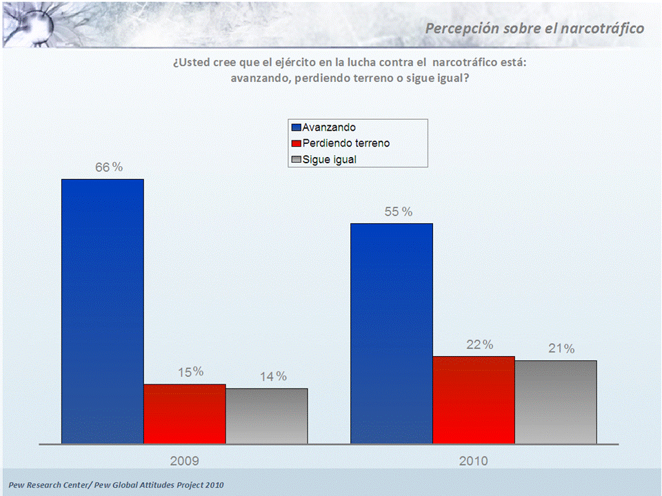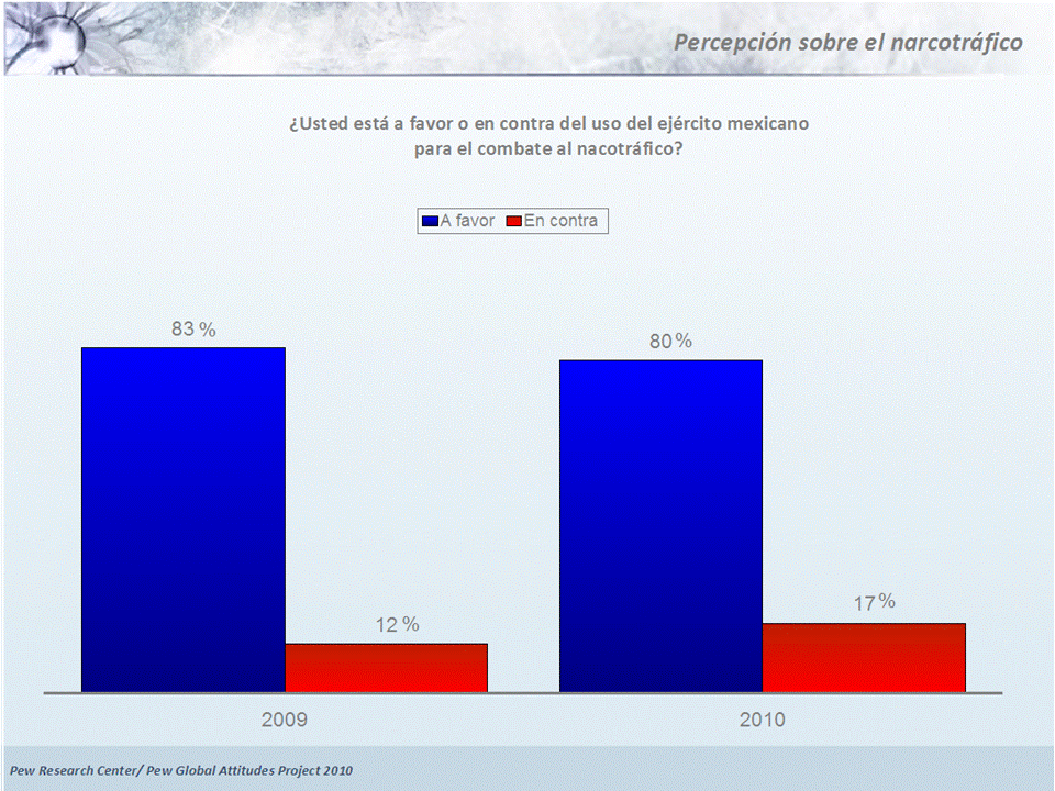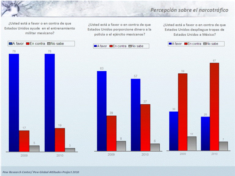 Una encuesta del Pew Research Center de mayo pasado revela que ocho de cada diez mexicanos –cifra que no cambió de 2009 a 2010-, están de acuerdo en que EEUU contribuya al entrenamiento del Ejército nacional; mientras que 57% apoya que los estadounidenses otorguen recursos económicos para combatir al narco. En contraste, únicamente 3 de cada diez personas (26%) respalda el despliegue de tropas armadas estadounidenses en territorio mexicano.