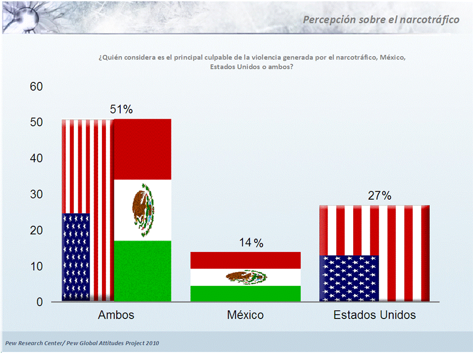 La investigación del Pew Research Center revela también que los mexicanos creen que la culpa de la violencia generada por el narco está repartida: 51% considera que es responsabilidad tanto de México como de EEUU; 27% que es sólo de EEUU y 14% únicamente de México. La encuesta fue realizada en dos etapas, primero del 14 al 20 de abril (antes de la promulgación de la Ley Arizona), y luego del 1 al 6 de mayo.