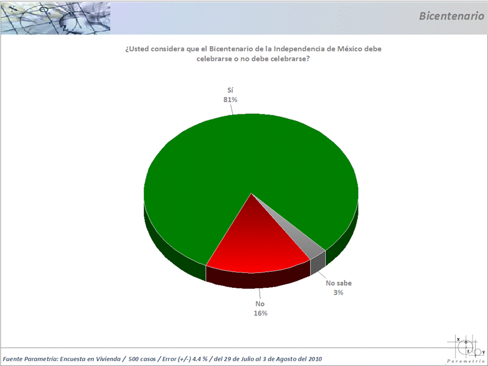 Para la mayoría de los mexicanos es necesario celebrar el Bicentenario de la Independencia de México Los datos de la Encuesta Nacional en Vivienda de agosto de Parametría revelan que el 81% de los ciudadanos piensa que la fecha debe celebrarse.