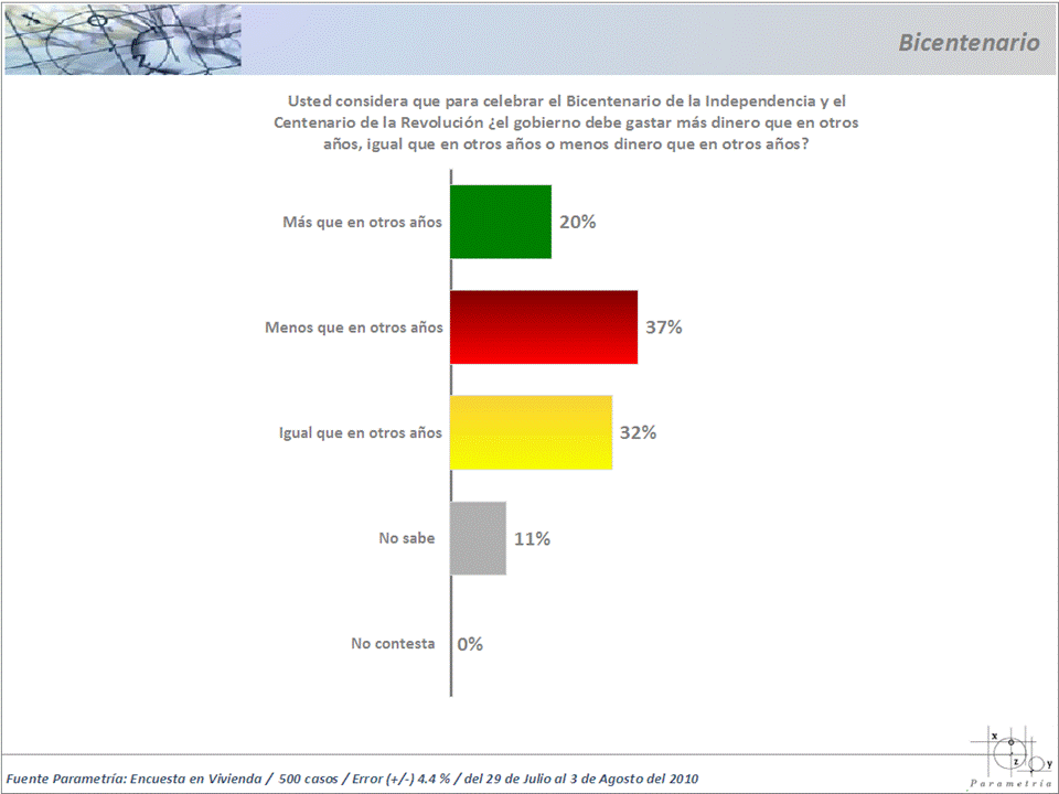 Sin embargo, la preferencia porque se celebren no significa que los mexicanos apoyen el gasto de 2 mil 900 millones de pesos que ha realizado el gobierno federal para celebrar el Bicentenario. Incluso y pese al ánimo por los festejos, la mayor parte de los mexicanos (37%) consideran que el gasto gubernamental debería ser menor en este año.