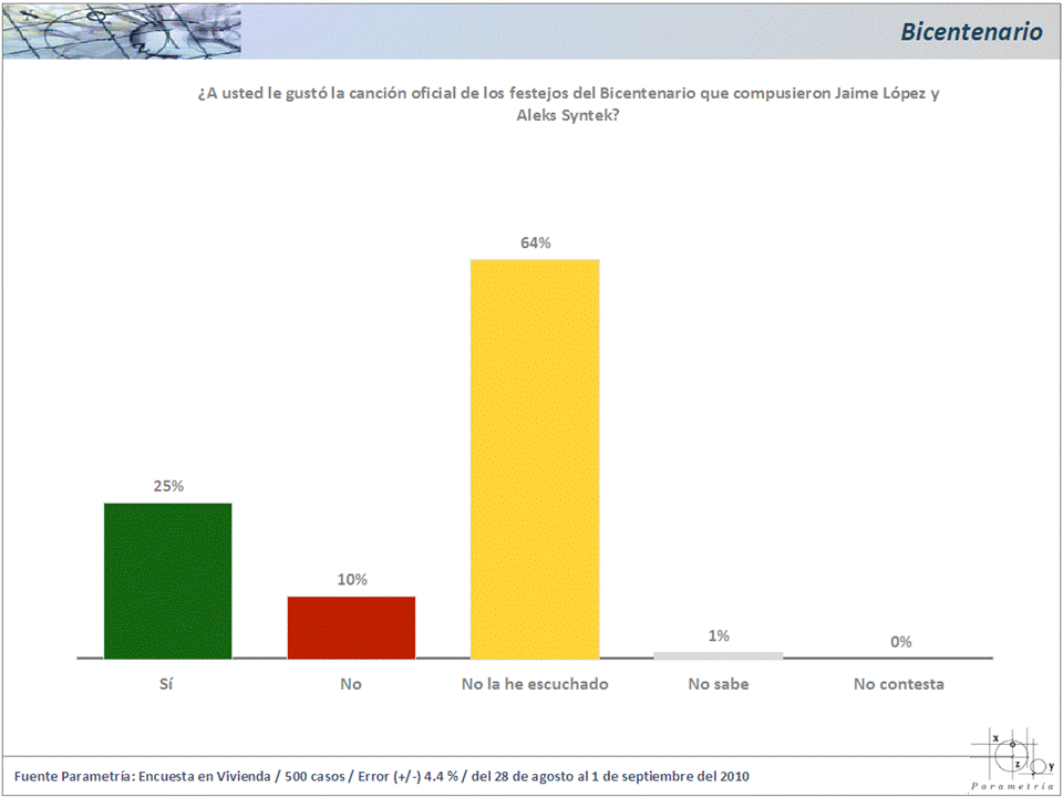 La difusión de la canción tampoco ha sido exitosa, pues el 64% de los encuestados dijo desconocer la pieza.