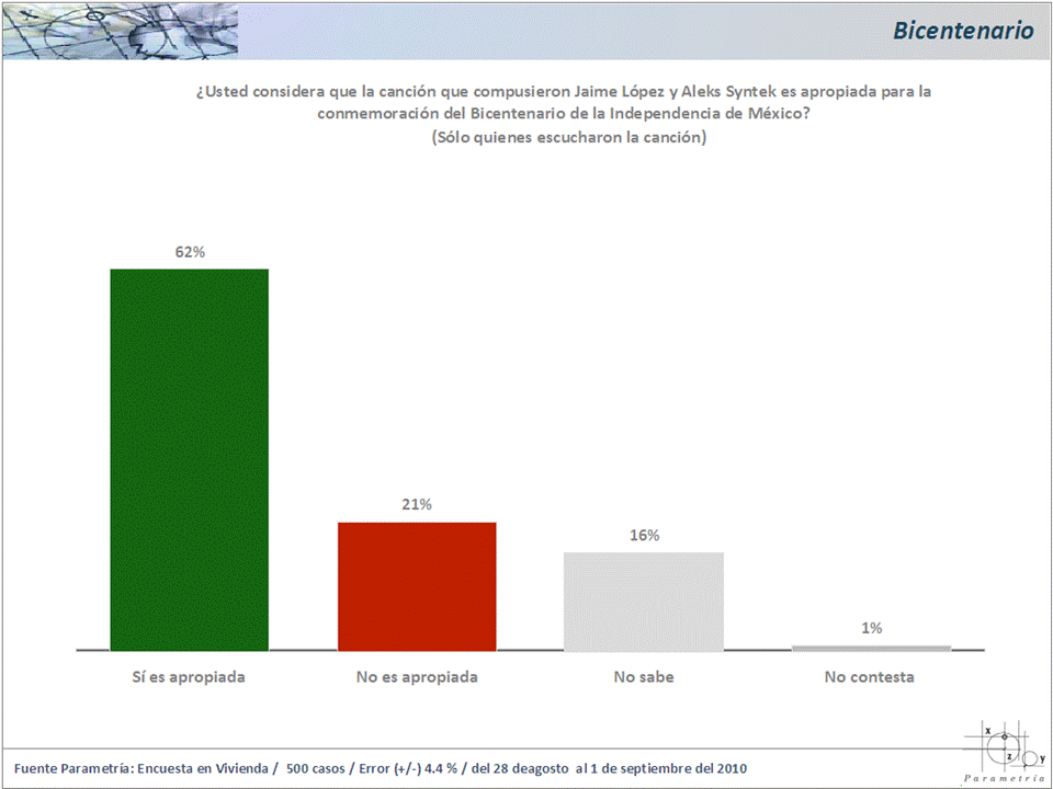 Sin embargo, no todos los elementos del festejo tuvieron el mismo impacto. Por ejemplo, la mayoría de la población (65%), desconoce que canción del Bicentenario – presentada por la Secretaría de Educación Pública-, fue compuesta por Aleks Syntek y Jaime López.