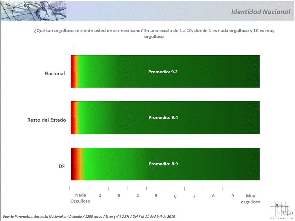 Por ejemplo, la Encuesta Nacional en Vivienda realizada en abril del 2010 indica que el 74% de la población otorga un 10 (en escala del 1 al 10) al orgullo que siente de ser mexicano. Sumados todos los datos, los mexicanos obtienen un promedio de 9.2 en su orgullo nacional.