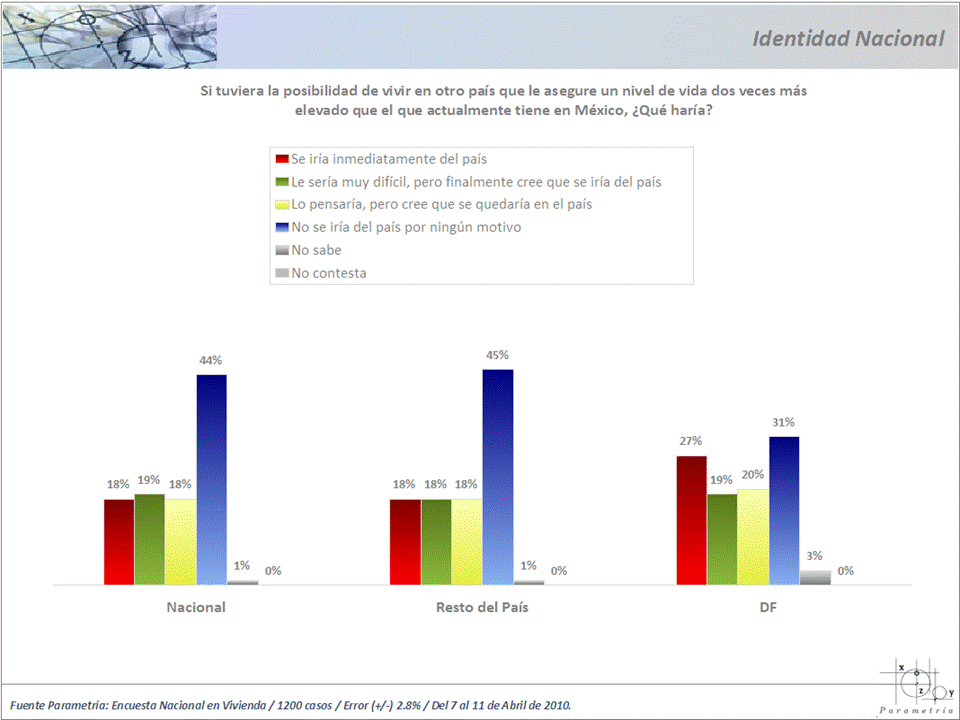 El alto grado de orgullo se ve reforzado con la poca disposición de los mexicanos a cambiar de residencia. Al ser cuestionados sobre la posibilidad de vivir en otro país, con mejores condiciones de vida, el 44% niega cualquier posibilidad de irse; el 18% dice que lo pensaría, pero que probablemente se quedaría en el país. Únicamente el 18% manifiesta que se iría de forma inmediata del país.