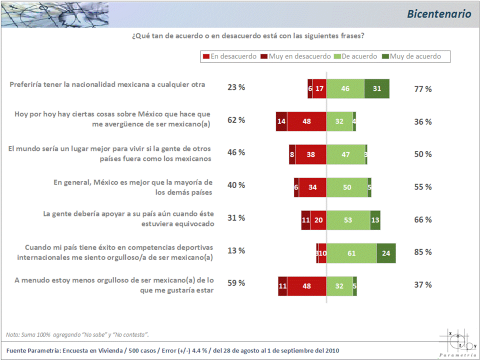 En la encuesta de Parametría de septiembre del 2010 se observa que ocho de cada diez mexicanos están conformes con su nacionalidad. Aún con eso, el 36% cree que hay algunos aspectos que les generan vergüenza de ser mexicanos.