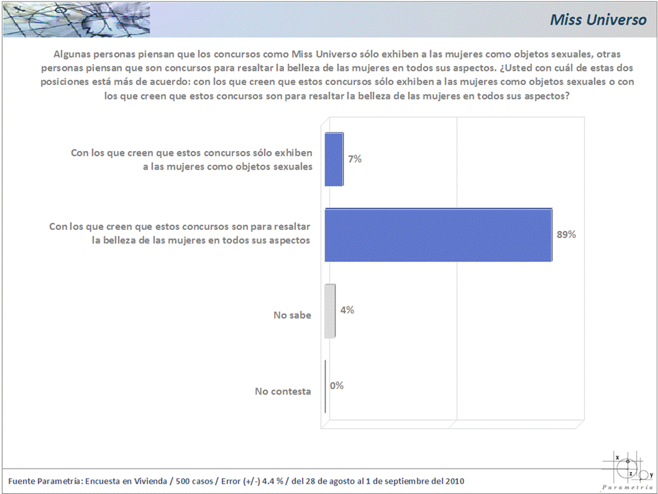 Lejos de las críticas vertidas por algunos sectores, el 89% de los ciudadanos cree que el concurso Miss Universo va más allá de la simple exhibición de las participantes como objetos sexuales, de acuerdo con los datos de la más reciente Encuesta Nacional en Vivienda de Parametría. Únicamente el 7% cree que el certamen exhibe a las mujeres de esta forma.