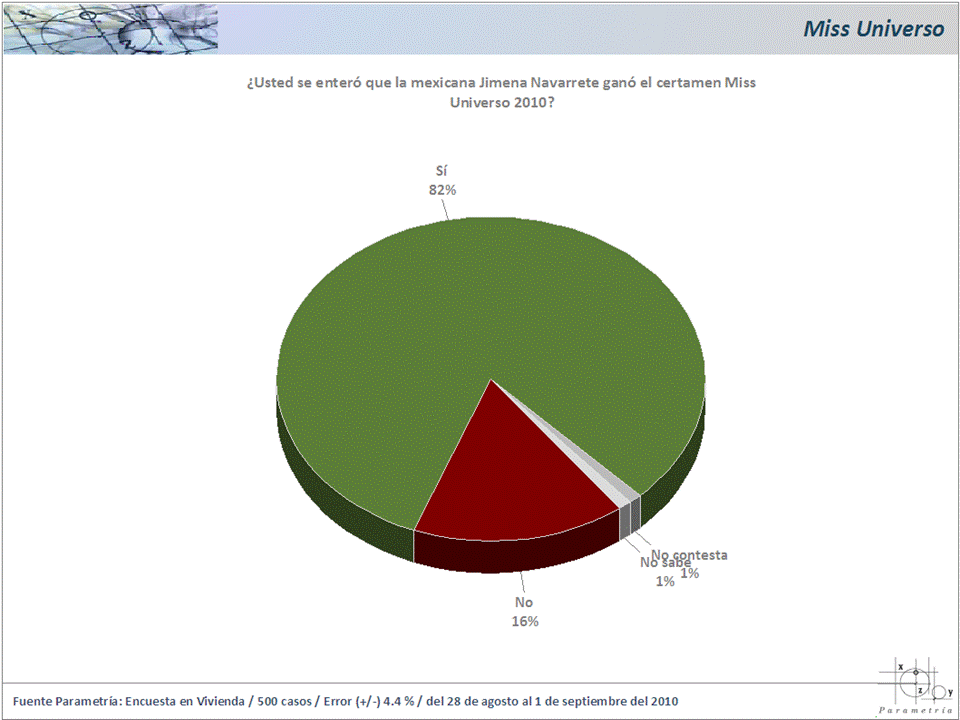 Además de salir bien evaluado, los resultados del concurso son ampliamente conocidos. El triunfo de la mexicana Jimena Navarrete en Miss Universo 2010 es conocido por el 82% de la población.