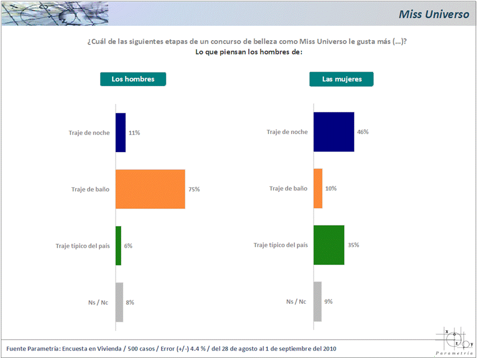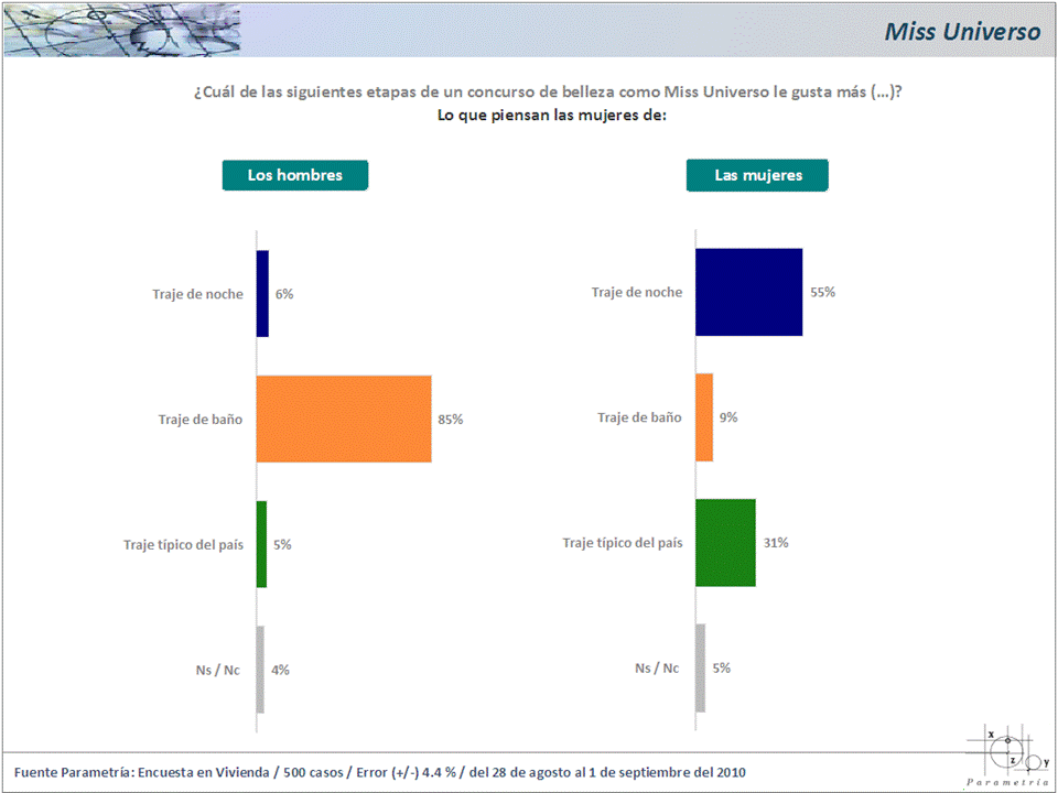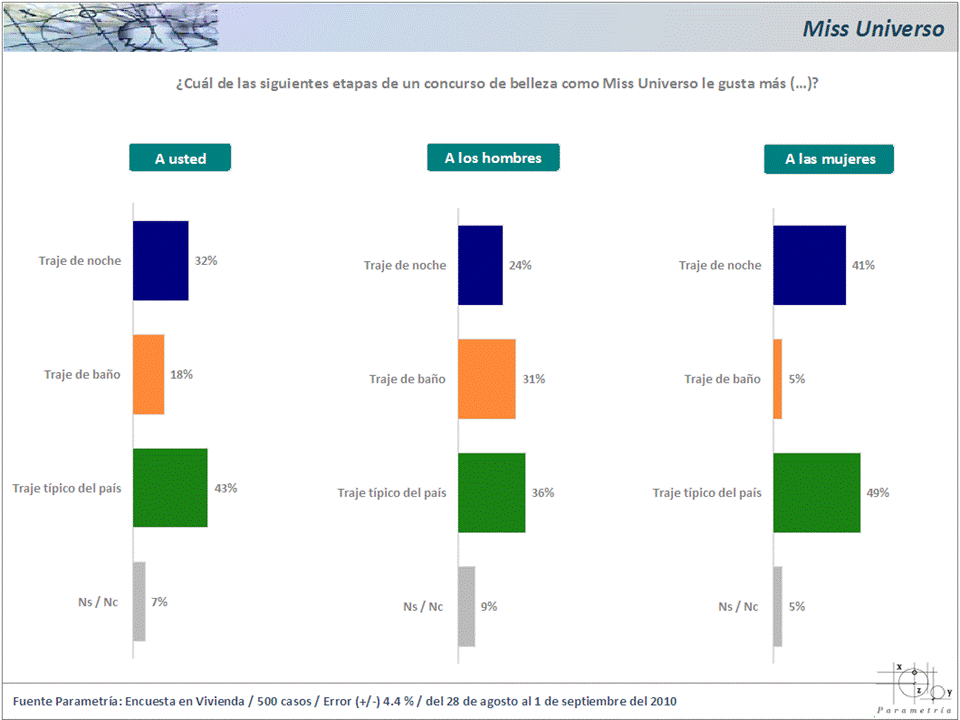 Sin embargo, los resultados de la encuesta revelan que para los mexicanos la etapa preferida de Miss Universo es la de traje típico, aunque el porcentaje varía entre hombres y mujeres.
