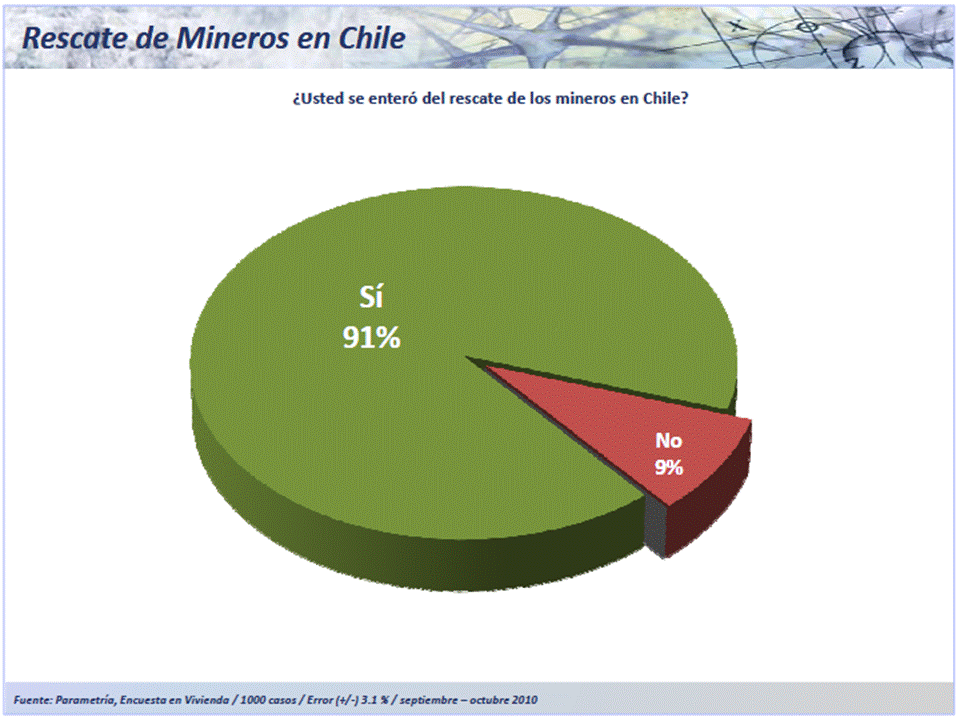 Los datos de la más reciente Encuesta Nacional en Vivienda de Parametría, muestran que el rescate de los 33 chilenos, ocurrido el 12 de octubre pasado –y convertido en el evento con más audiencia en internet-,[1] es conocido por 9 de cada diez mexicanos.