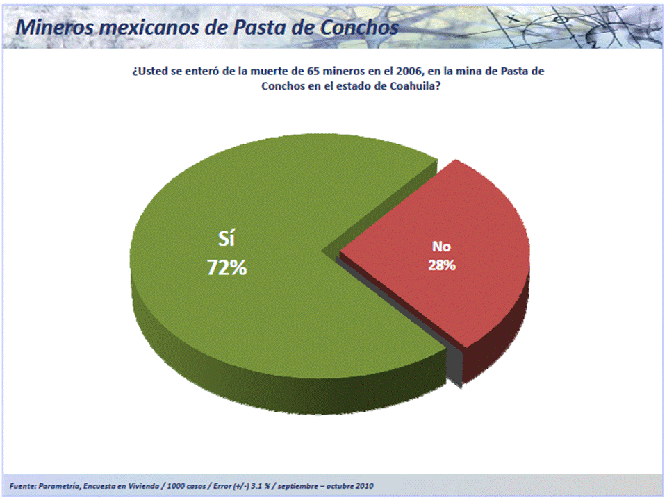 Por otro lado, el suceso de la muerte de los mineros en Pasta de Conchos –ocurrida en el estado de Coahuila en 2006- aún sigue siendo recordado por el 72% de la población. Un número alto si se considera que fue un evento que ocurrió hace 4 años.