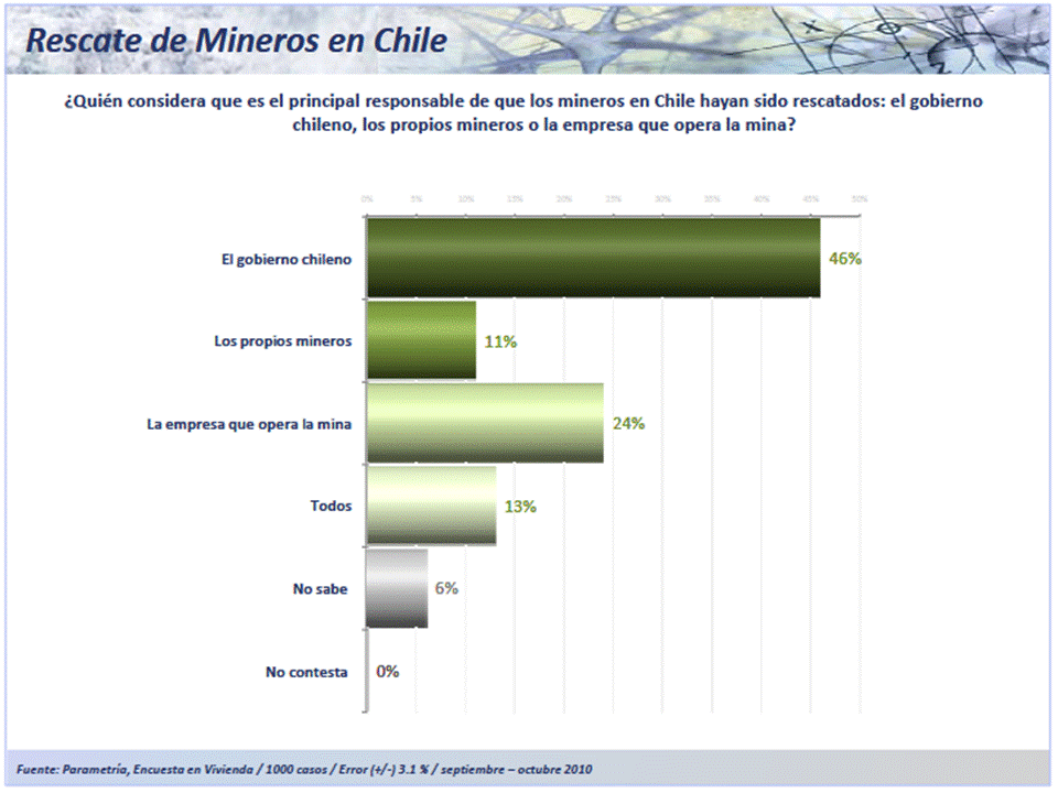 El rescate de los mineros chilenos fue un evento que captó la atención de la mayoría de los mexicanos, quienes atribuyen al gobierno de aquel país el rescate con vida de los trabajadores metalúrgicos. Mientras que en el caso de la muerte de los 65 mineros mexicanos de Pasta de Conchos, la gente cree que fue responsabilidad de la empresa que explotaba la mina, aunque la actuación del gobierno federal en los trabajos de rescate aún sigue dejando dudas entre la población.