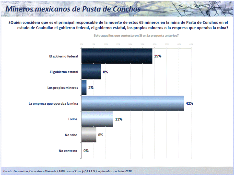 Para el caso mexicano, en el que las operaciones de rescate fueron suspendidas, la responsabilidad de la muerte de los mineros se achaca principalmente a la empresa minera (42%). Tres de cada diez mexicanos, el 29%, considera que la tragedia es responsabilidad del gobierno federal, 8% cree que es del gobierno estatal y apenas el 2% le adjudica la culpa a los mineros. En tanto que el 13% dice que la muerte de los trabajadores fue responsabilidad de todos los involucrados.