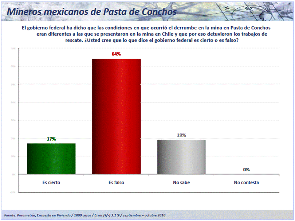 Aún con la poca responsabilidad atribuida directamente al gobierno federal, la mayoría de la población (seis de cada diez) cree que son falsas las estimaciones del gobierno federal sobre la diferencia de condiciones en las minas (Pasta de Conchos en México y San José en Chile) y la interrupción del rescate en el caso mexicano.